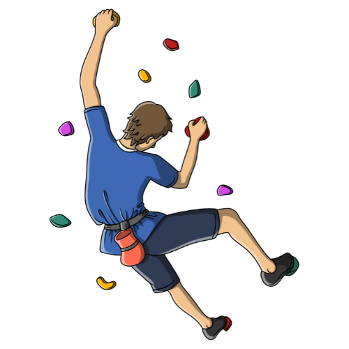 Les grimpeurs utilisent généralement des chaussons d'escalade (appelés aussi chaussons). Ils offrent une meilleure adhérence et un meilleur contrôle sur les prises. Des chaussons peuvent être loués à l'accueil. Cependant, ils ne sont pas obligatoires pour une première séance. Il suffit d'avoir des chaussures de sport propres, idéalement avec une semelle fine. Attention : les chaussons d'escalade sont utilisés uniquement pendant la grimpe et ne remplacent pas les chaussures de sport pour le reste de l'entraînement.